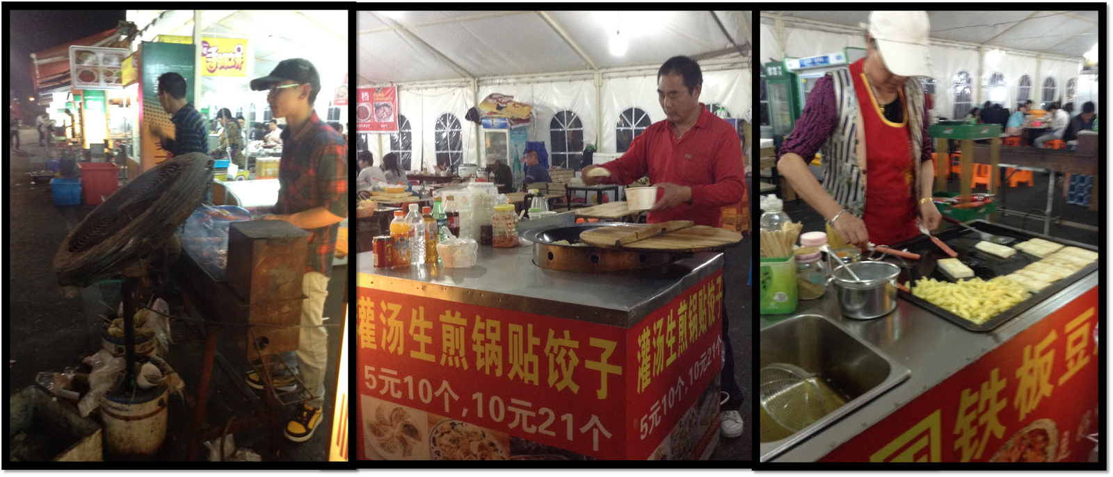 In China, the street food is everywhere and covers a lot of different food groups. Many of them are grills, which are mobile, and are out around dinner time and remain out until close to midnight. They set up their carts on busy street corners (especially around shopping districts, clubbing districts, or high-traffic night life areas) and start grilling, luring in peckish pedestrians with the tantalizing smells of grilled, cheap food.